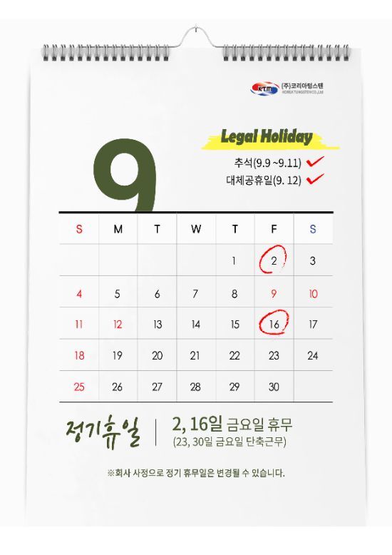 코리아텅스텐 2022년 9월 정기휴무 안내